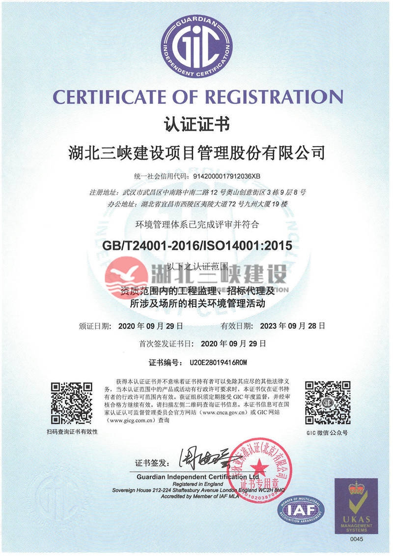 环境管理体系认证证书