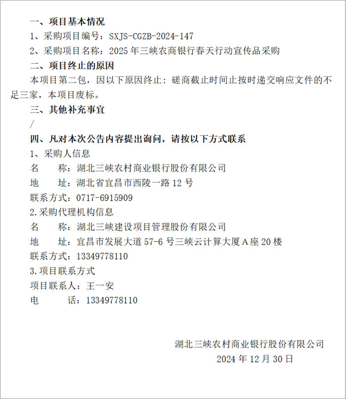 2025年三峡农商银行春天行动宣传品采购(包二) 废标公告