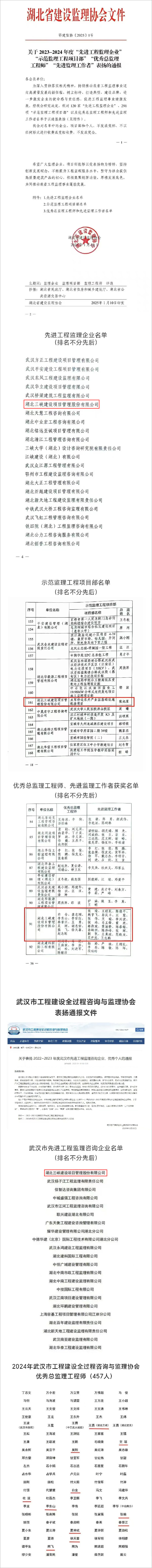 近日,在湖北省建设监理协会发布的2023-2024年度省级“先进工程监理企业”、“示范监理工程项目部”、“优秀总监理工程师”、“先进监理工作者”和武汉市工程建设全过程咨询与监理协会发布的2022-2023年度武汉市“先进工程监理咨询企业”、“优秀个人”的评选结果公告中,太阳成集团tyc33455ccwww再获殊荣。 此次评选结果,太阳成集团tyc33455ccwww荣获2023-2024年度省级“先进工程监理企业”、2022-2023年度武汉市“先进工程监理咨询企业”荣誉称号;点军桥边农卉产业园基础设施配套项目监理部荣获“省级示范监理工程项目部”荣誉称号;谢忠安、秦晋江、白全、李东山、李世红、王勇、吴刚、熊飞、徐天喜、赵志刚荣获“省级优秀总监理工程师”荣誉称号;白全、杜波、熊飞、徐天喜、夏忠斌、秦晋江、张瑜、李东山、文瑞、王勇、吴刚荣获“武汉市优秀总监理工程师”荣誉称号;鲍宇飞、陈恭铭、陈俊平、陈泽峰、董亮、都啟斌、范晓光、黄清桥、荆凯、李兴波、倪玮、孙岭洲、汪慧、王旺民、王勇政、王志鹏、文瑞、肖王锋、张辉、张伟、张瑜、左开亮荣获“先进监理工作者”荣誉称号。