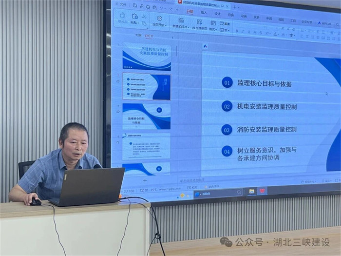 本次会议,管控部鲍宇飞详细通报了各项目考核结果,通过数据对比和案例分析,既指出了当前存在的典型问题,也对项目部下步重点提出了管理建议。项目部总监熊飞分享《监理安全责任案例分析》,系统讲解了新旧《建筑法》条款对比,监理需落实“方案先行”“旁站监督”“隐患闭坏”等规范要求。项目总监张辉分享《高速作业升降工作平台安全管控与实操要点》,安全风险如影随形,隐患潜藏细微之中,时刻绷紧安全之弦,细心守护安全底线。项目机电安装专家邹建新围绕《房建机电安装监理质量控制》主题展开分享,内容聚焦房建机电与消防安装两大板块的监理质量控制要点。结合其多年现场监理实践经验,以保利·山海大观、沃东应急救援项目等实际案例为切入点,通过阐述全流程监督管理的具体措施与执行标准,监理确保机电及消防系统最终达到设计标准,实现安全可靠运行。